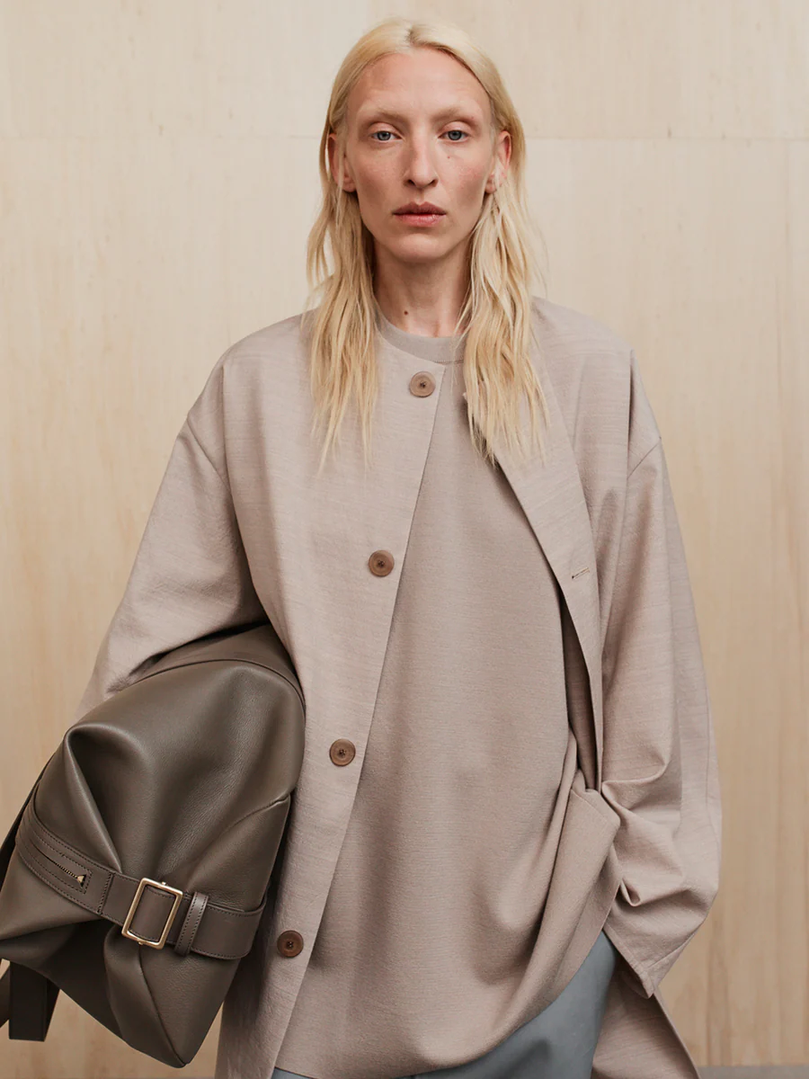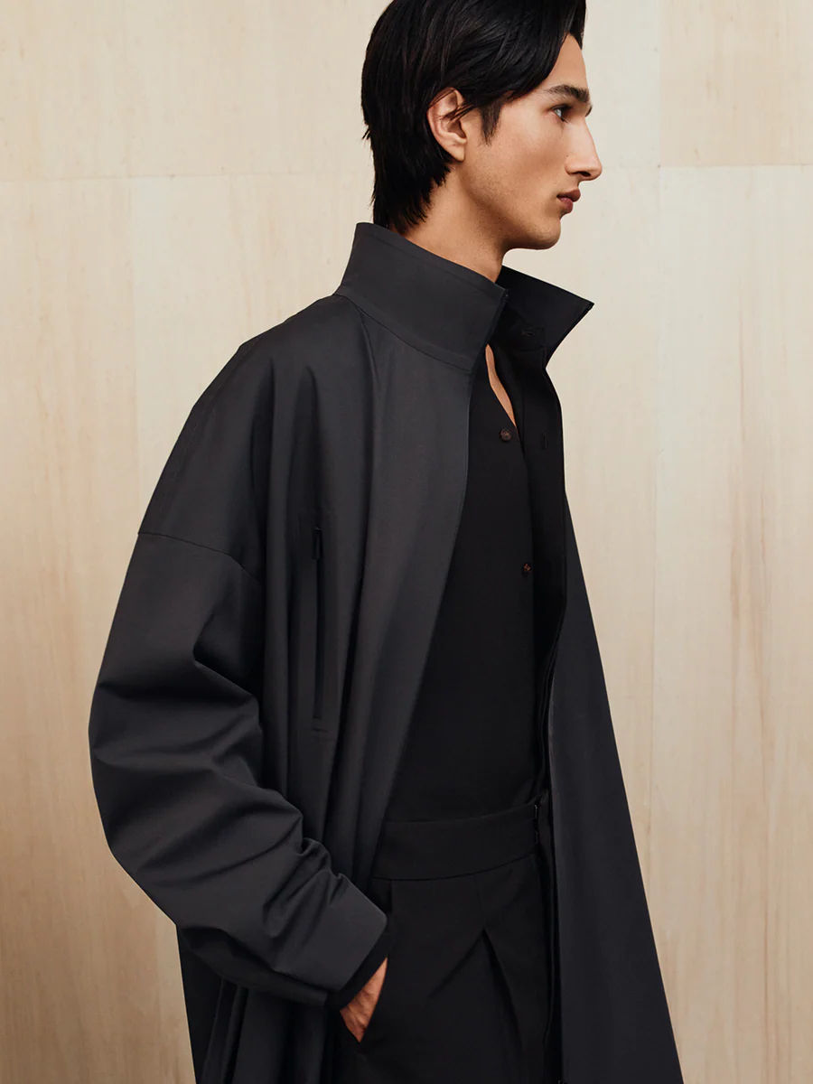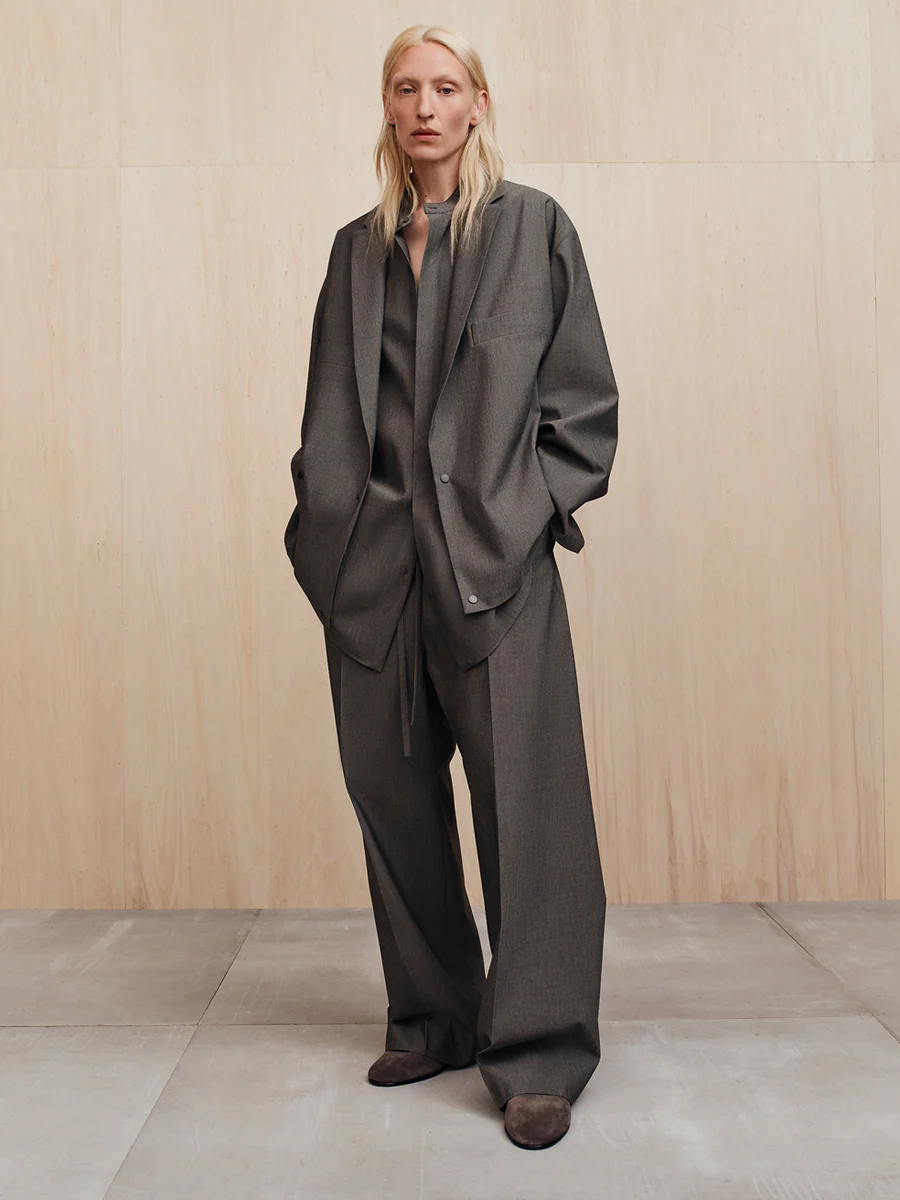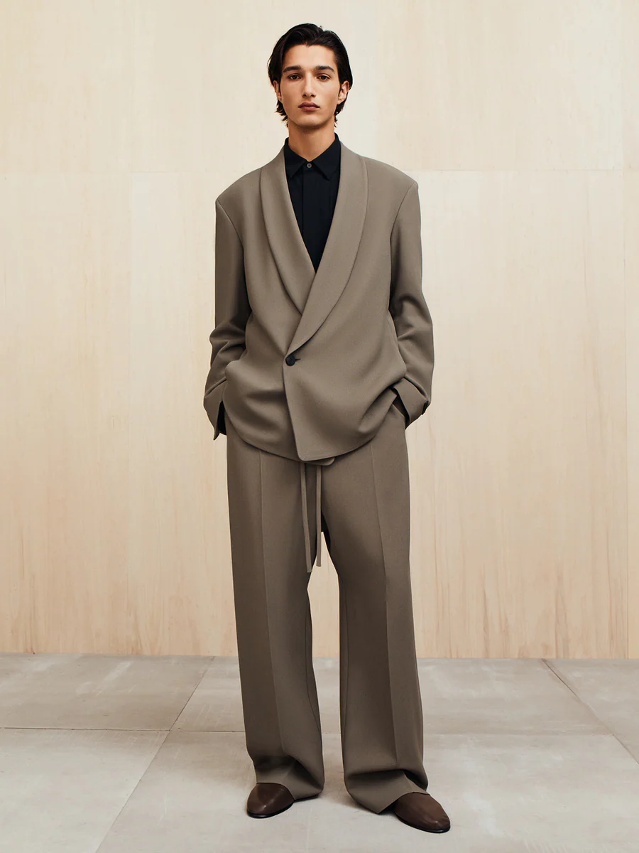 Esta filosofía se traduce en una elegancia discreta. La colección es un ejercicio de equilibrio, donde la sastrería y el sportswear se mejoran mutuamente. Piensa en trajes de una caída impecable, confeccionados en lana italiana o en tejidos técnicos ripstop, pero con siluetas relajadas que te permiten moverte, vivir. Los hombros son redondeados, evocando la forma de una chaqueta de béisbol clásica, eliminando cualquier rigidez y apostando por una comodidad que roza lo espiritual.