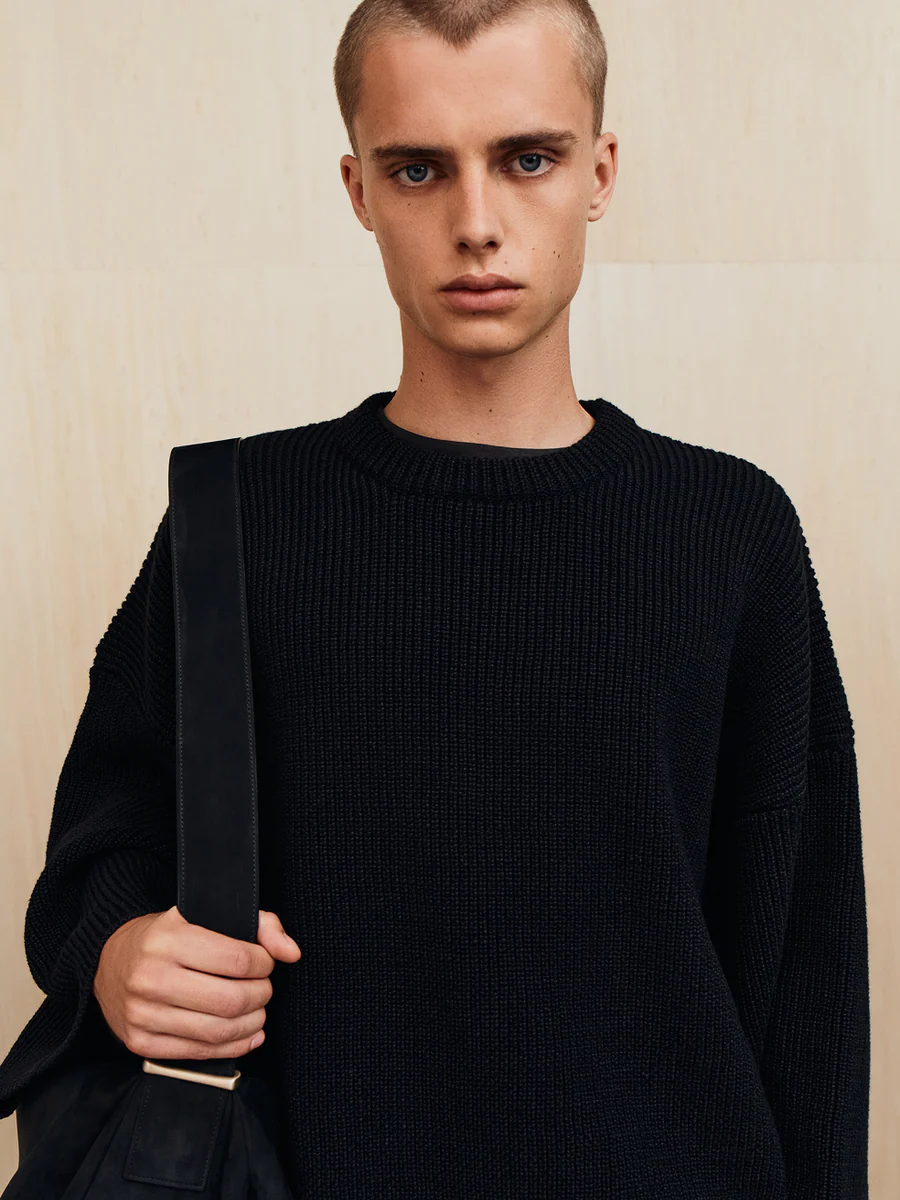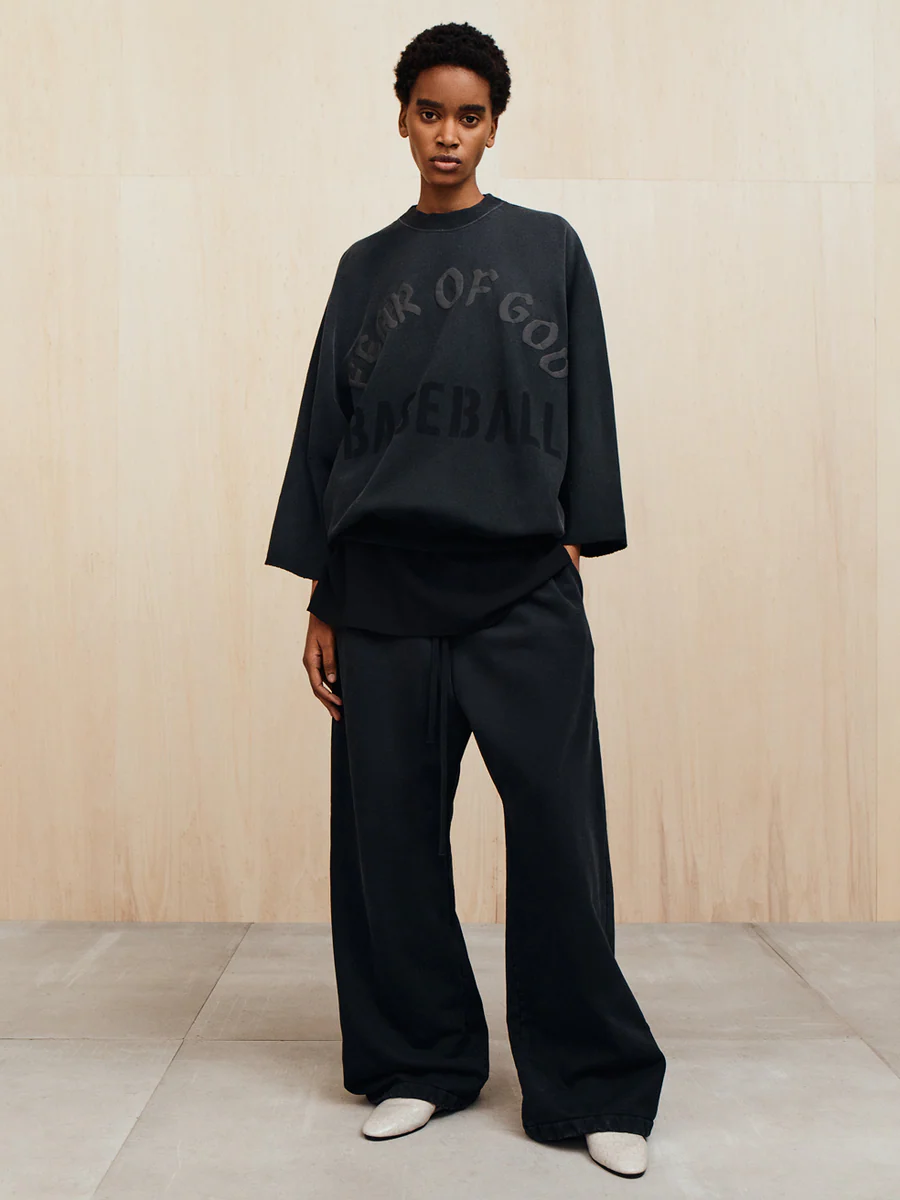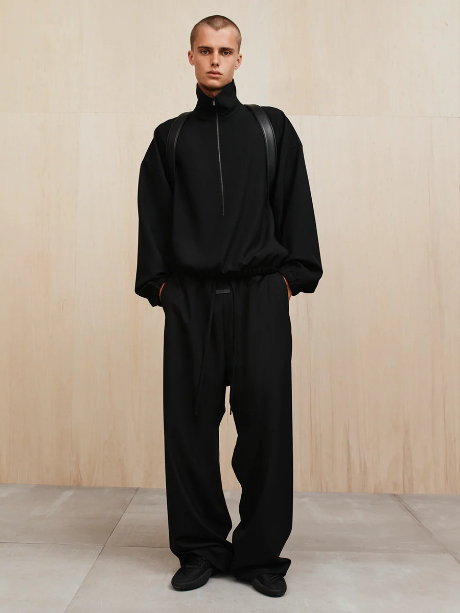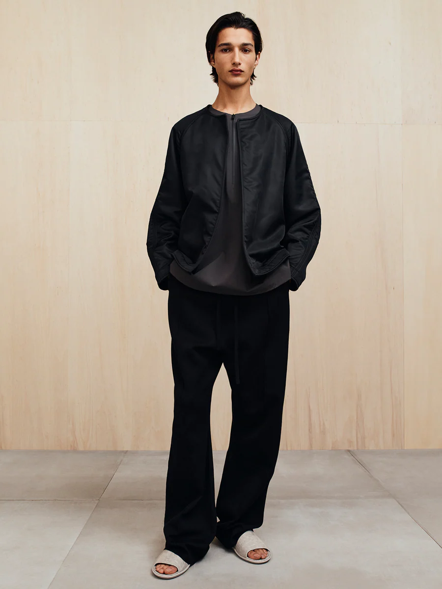Es aquí donde Lorenzo brilla. Toma los arquetipos del armario masculino estadounidense y los eleva a un nuevo estatus. Unos pantalones de chándal slouchy se visten con las icónicas rayas diplomáticas de los Yankees, convirtiendo una prenda de estar por casa en una declaración de intenciones. Las camisetas de algodón grueso y los polares, fabricados en Los Ángeles son los cimientos de un look estudiado, con un gramaje y una textura que se sienten sustanciales. El denim de corte recto, las chaquetas trucker y las botas de ante son reconocibles, sí, pero han sido redefinidos a través de la lente de Fear of God: proporciones equilibradas, buenos materiales y atención al detalle.
