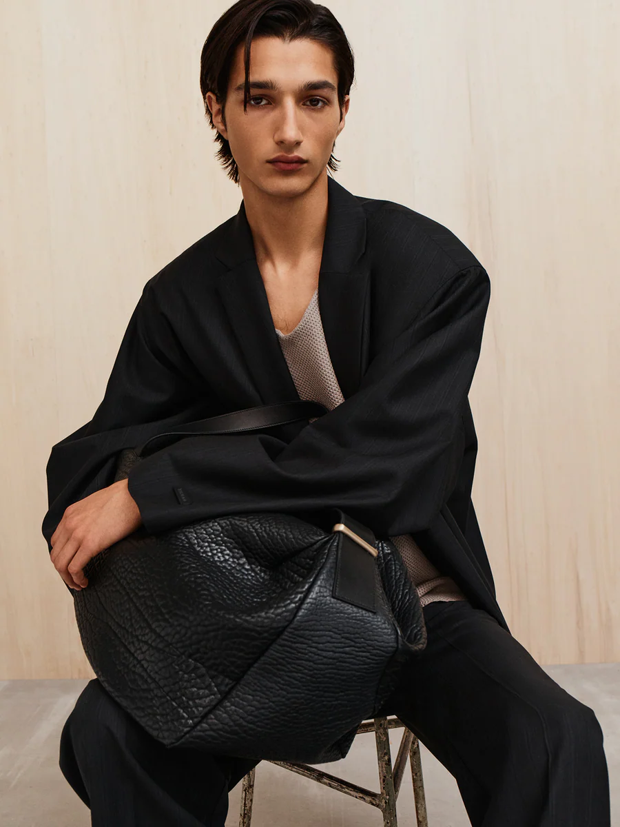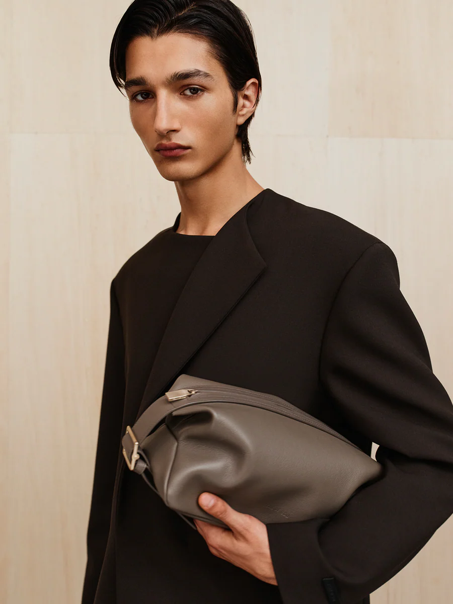 Los accesorios son el punto final que remata la jugada. Mules deportivos y zapatillas de ante que borran la línea entre el calzado de interior y el de exterior. Los bolsos, en piel y nobuk, tienen formas suaves y orgánicas, diseñados para colapsar y adaptarse a su contenido. Destaca un bolso de nylon cuya forma está directamente inspirada en las bolsas de equipamiento que usan los jugadores, un toque conceptual que cierra el círculo temático.
